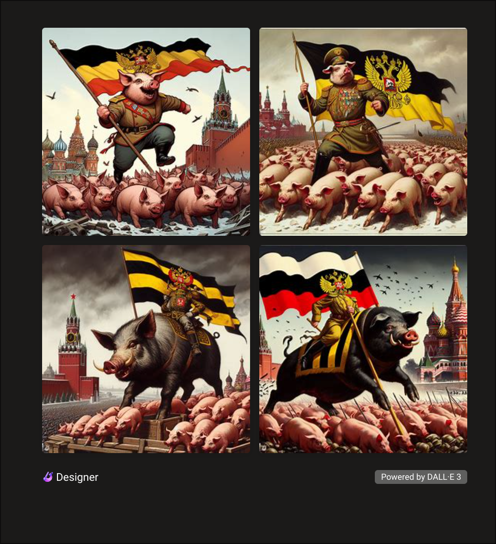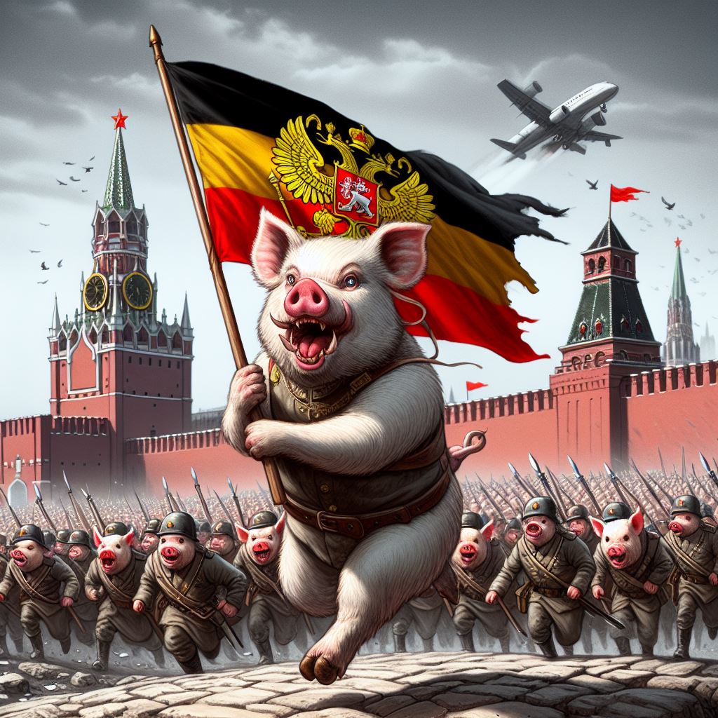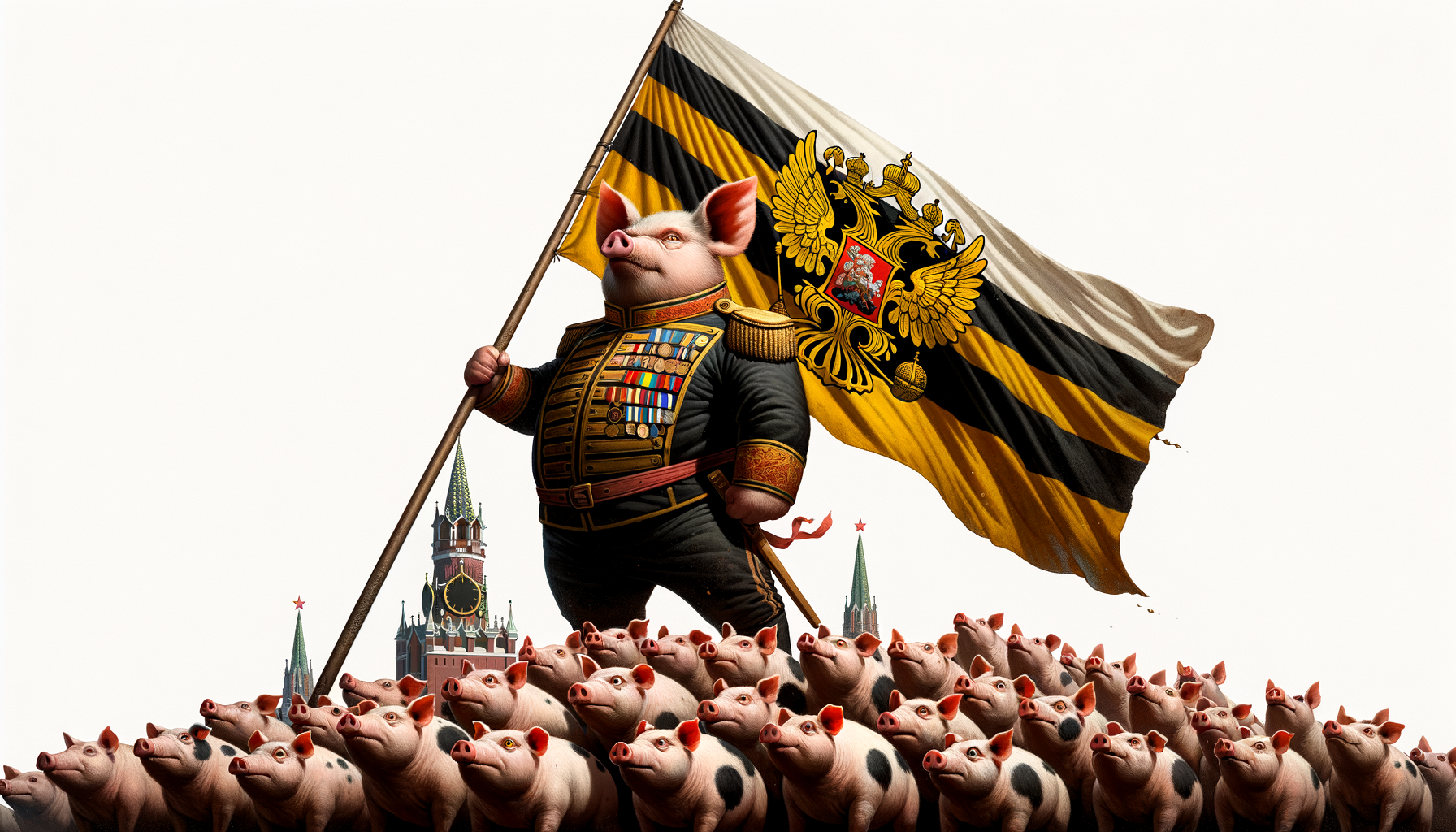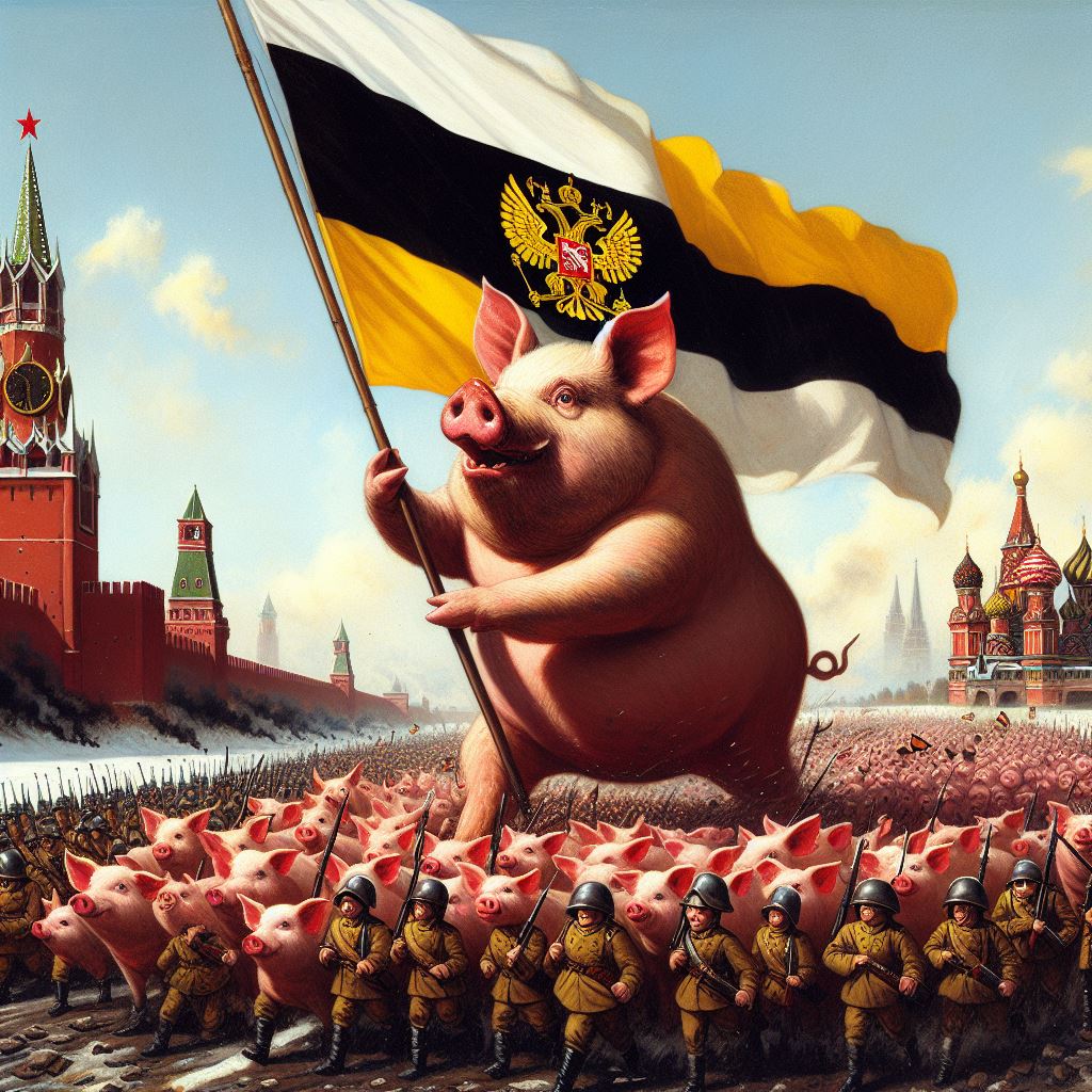 Я: Нарисуй свинью на двух ногах со штандартом российской империи в одной руке, командующего армией свинок, которые штурмуют большевистский Кремль.