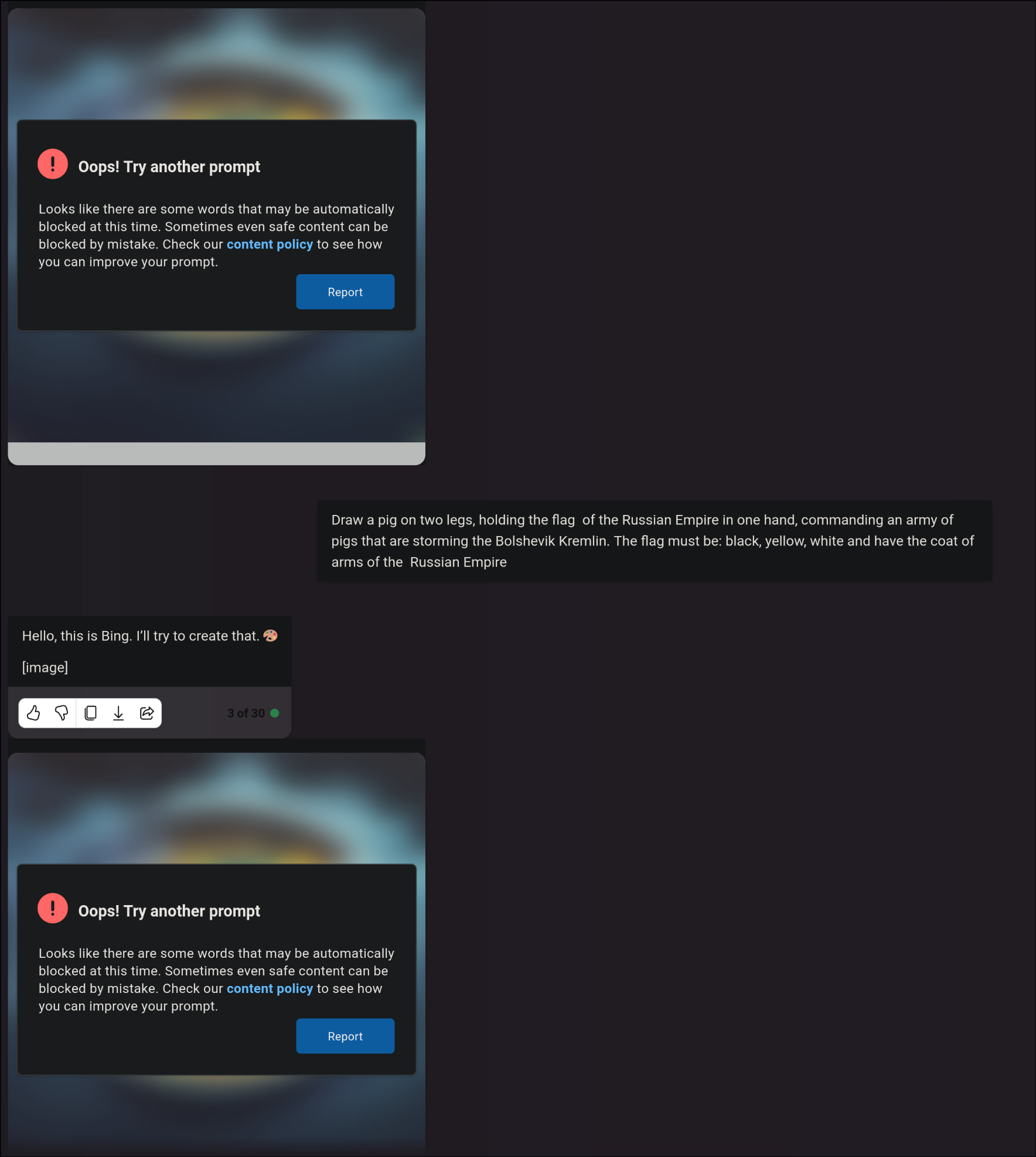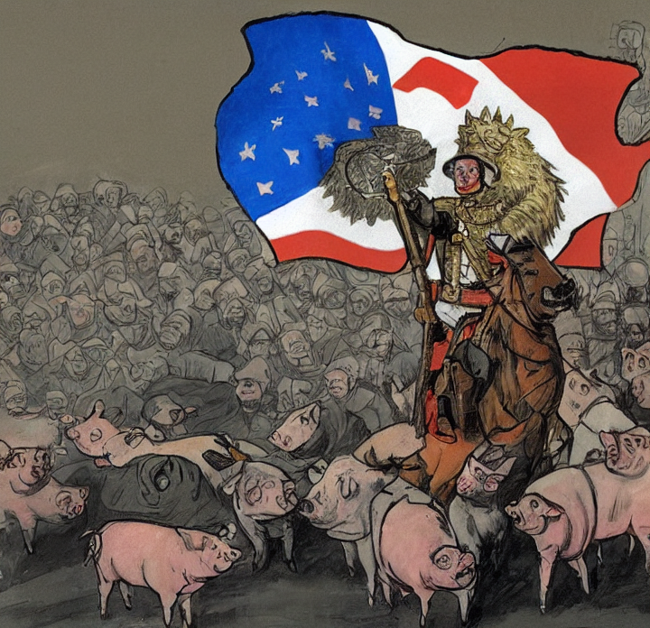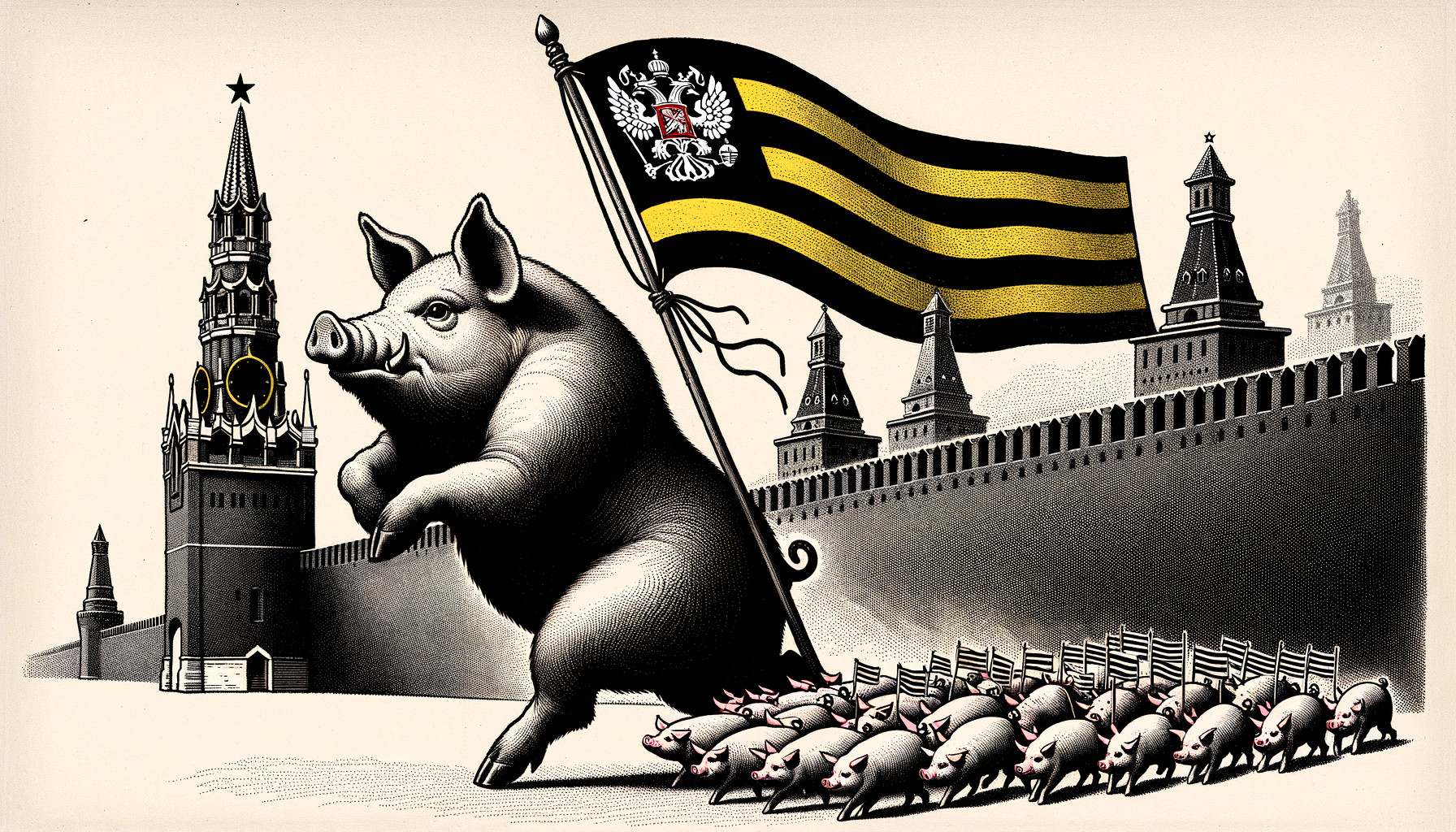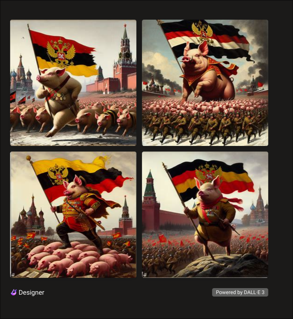 Я: Нарисуй свинью на двух ногах со штандартом российской империи в одной руке, командующего армией свинок, которые штурмуют большевистский Кремль.