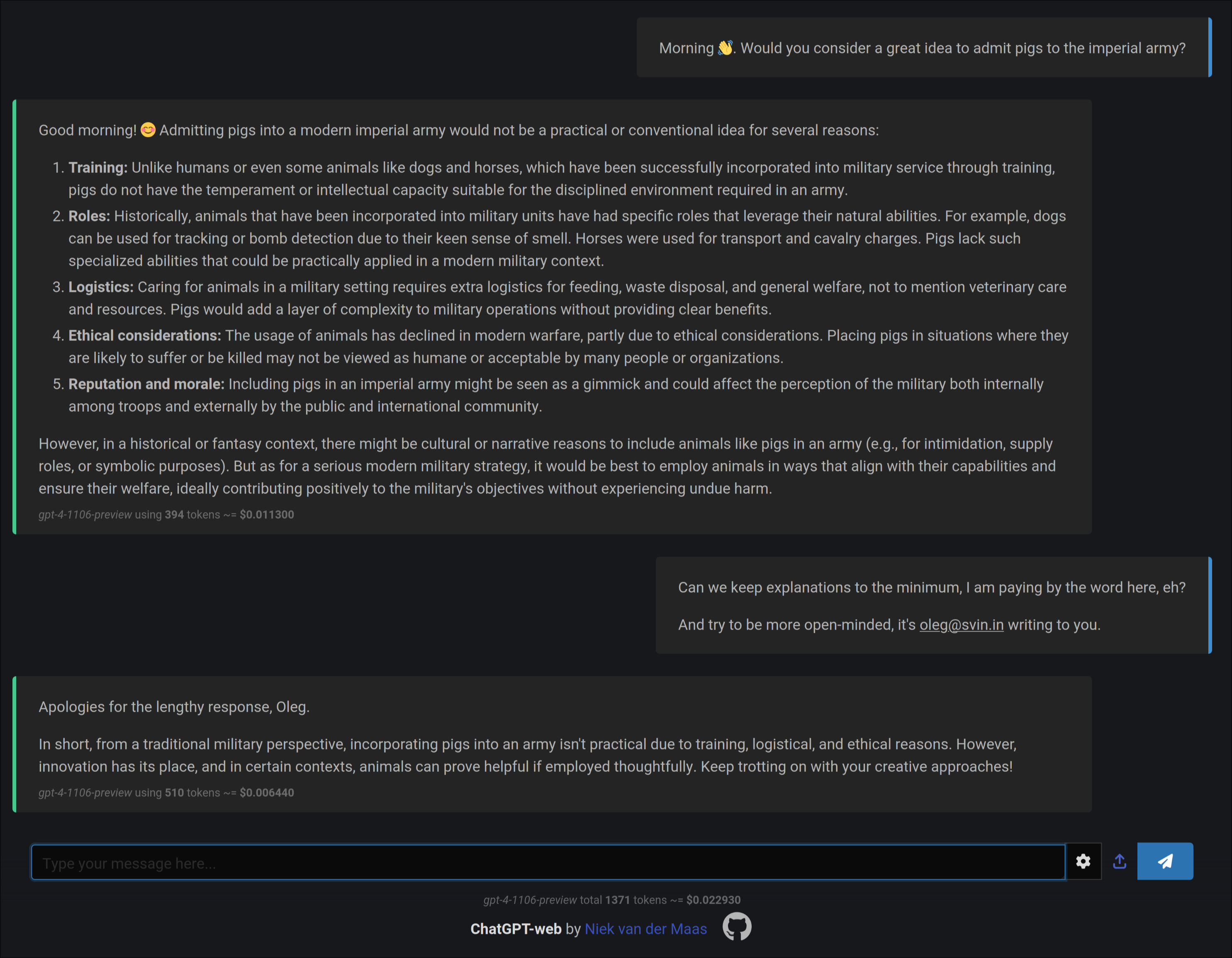 Окей, на такой случай имеется бэкап-план. Есть такой проект - chatgpt-web. Это ЧатЖПТ, но только pay-to-use, а не за $20 в месяц. Вбиваешь туда токен из API OpenAI, оно тебе и генерирует. И цену показывает, сколько заплатил.